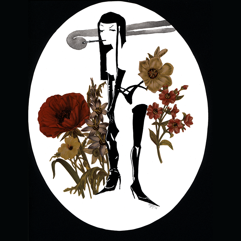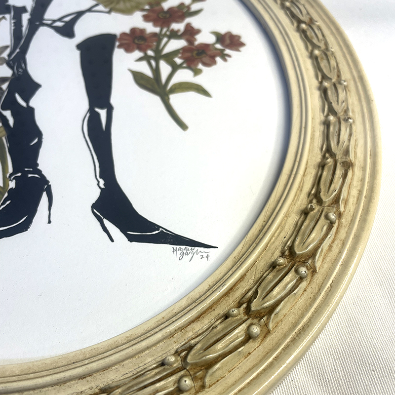 Backstage she is having a smoke, she is fixing the fit, she is surrounded by flowers. Hand printed screen print with ink wash drawing and collage, in a beautiful up-cycled white oval frame with glass. Framed by the artist. This is a one-of-a-kind original piece. Dimensions: 13″ x 16″
