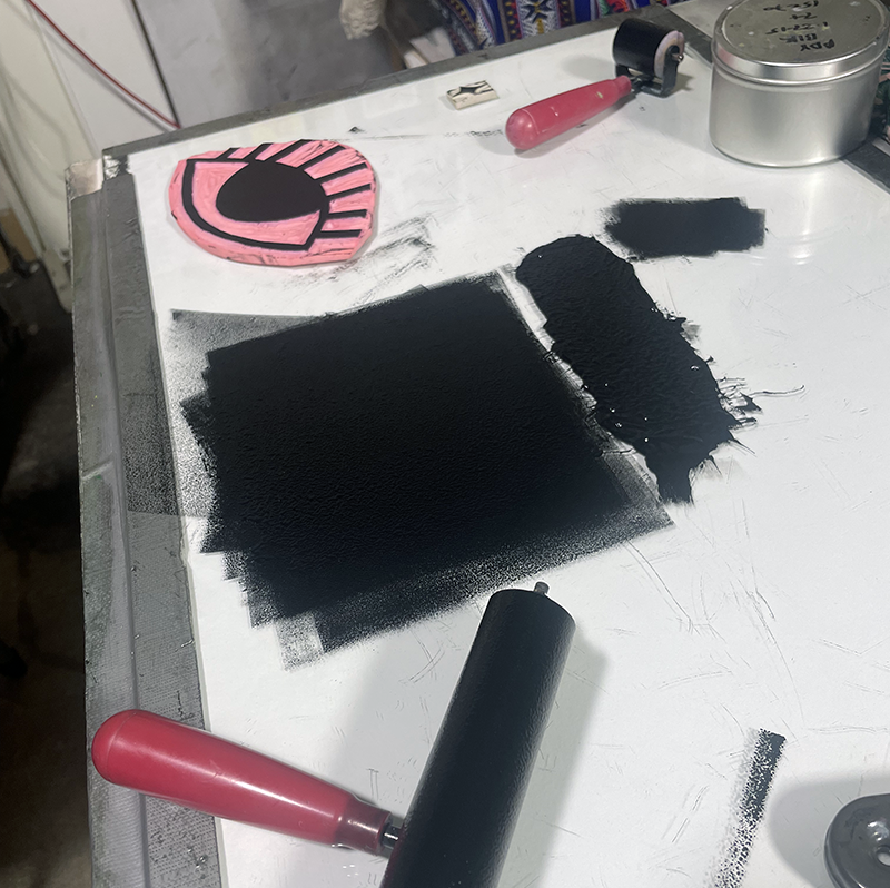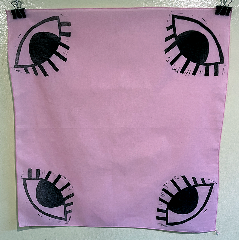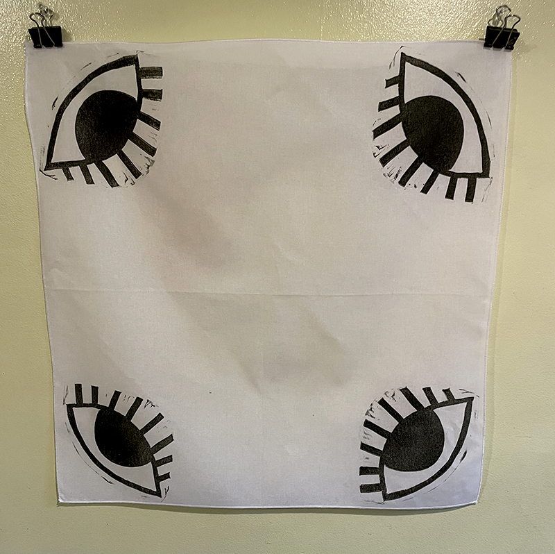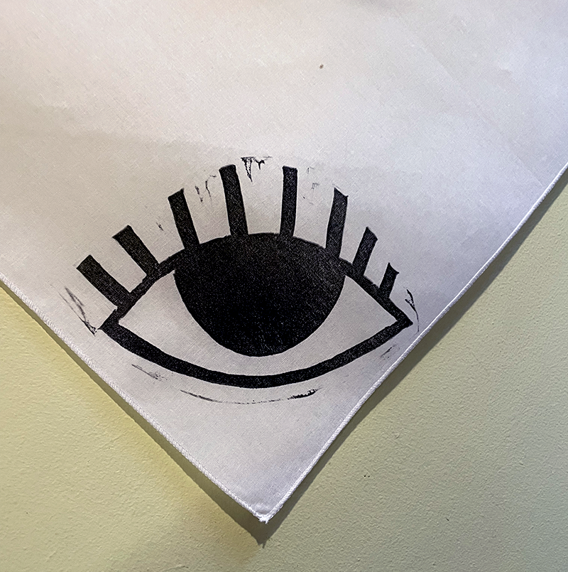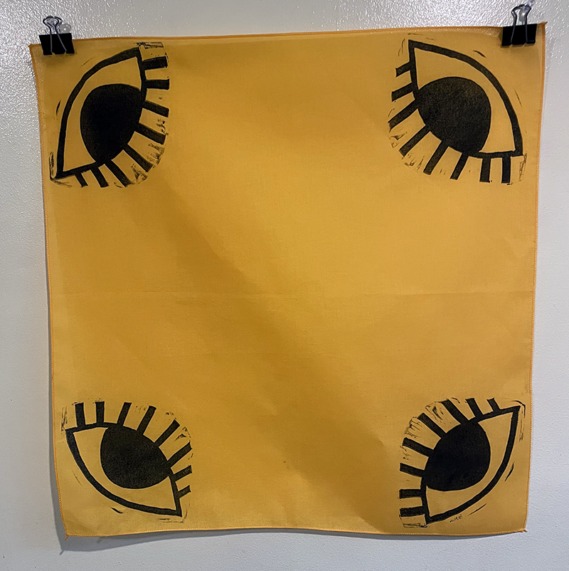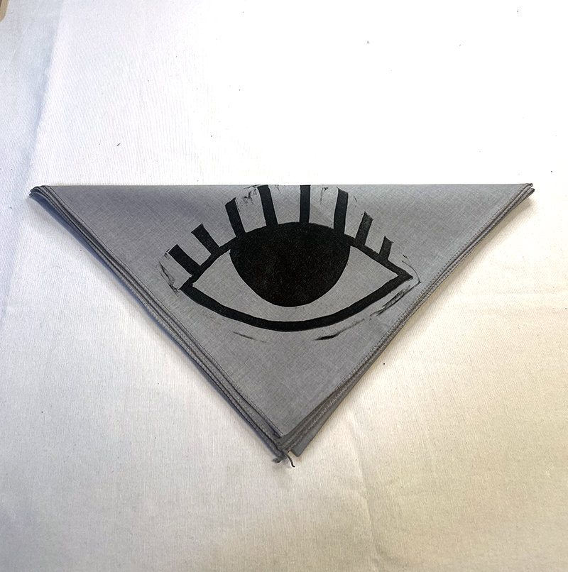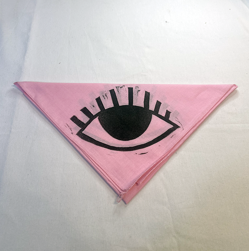 Hand-printed bandana featuring a big eye design on each corner. Printed with oil based ink from a single hand carved speedy cut block, each bandana is ever so slightly different and unique. Available in pink, white, grey and gold.